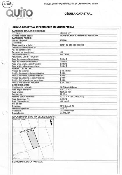 Extranjero vende terreno de 1241m2 en el barrio La Pulida, Cochapamba, Quito.